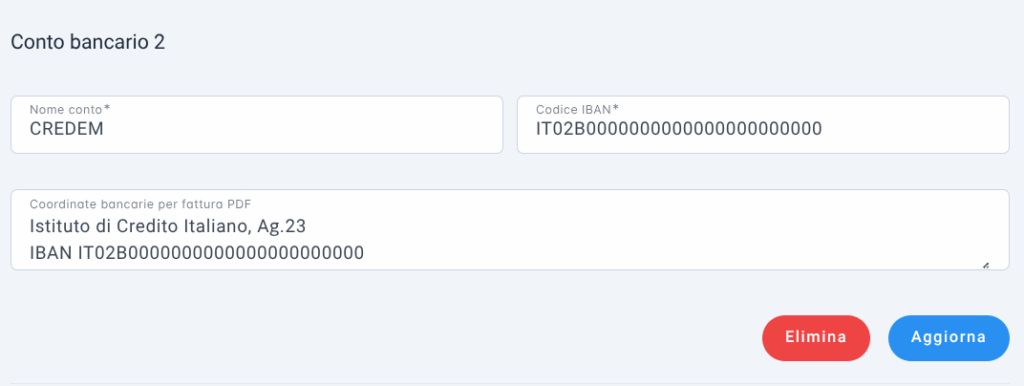 Il campo “coordinate bancarie” se lasciato vuoto, in fattura sarà riportato il solo codice IBAN, invece se compilato, ricordati di riportare il codice IBAN anche anche in questa sezione in modo tale che risulti sul pdf della fattura.