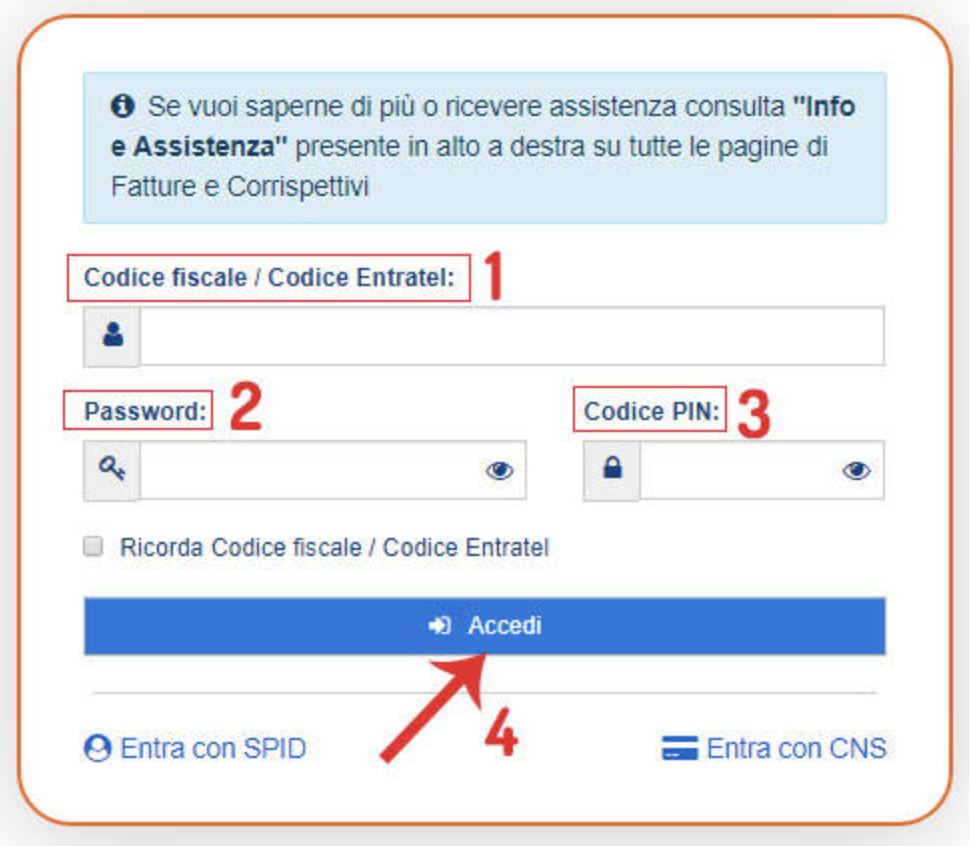 Si visualizzerà quindi una schermata simile a quella dell’immagine qui a fianco, tramite la quale si potrà eseguire l’accesso al proprio cassetto fiscale. L’accesso può avvenire con le credenziali specifiche (CF+password+pin) oppure anche con SPID o con CNS. Quindi si preme “accedi”.