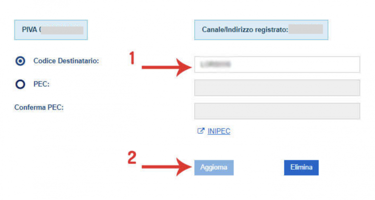 Infine si potrà inserire nell’ apposito campo (il numero 1 nell’immagine) il codice destinatario. Quindi si aggiornano le impostazioni (rif num. 2). Come si potrà notare, se si era inserita una PEC, inserendo il codice destinatario la PEC risulterà disattivata.