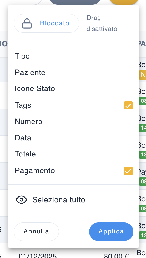 Vi sono alcune colonne che è possibile disattivare, in modo da non renderle visibili in elenco documenti (ciò ad esempio per ottimizzare lo spazio di elenco documenti), ovvero “tags” e “pagamento”.