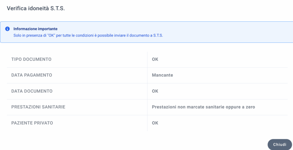 All’interno del bottone azioni STS (giallo con una valigetta medica) in elenco fatture, di fianco ad una fattura che non presenta la dicitura “STS da inviare” (ma che dovrebbe invece averla), è possibile trovare un comando rapido di “verifica idoneità”, che permette rapidamente di comprendere la/le ragione/i di inidoneità. Il documento potrà quindi essere rapidamente modificato e, quindi, trasmesso a STS.
