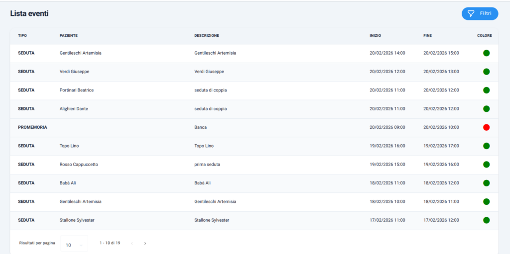 • Tipo: la tipologia dell’evento: “seduta”, “promemoria” o “nuovo paziente”
