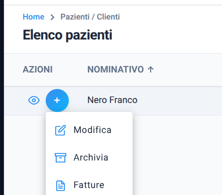 Accedendo all’elenco dei pazienti/ clienti, basterà cliccare sul bottone blu col più, e poi “Modifica”.