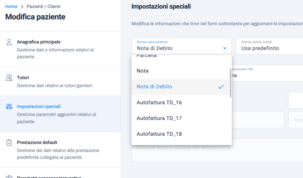 Per emettere una Nota di Debito è necessario apportare una modifica temporanea alla scheda anagrafica del proprio paziente/cliente. Ciò per indicare al sistema che si andrà ad emettere una sorta di “fattura speciale”, appunto una nota di debito. Vediamo come.