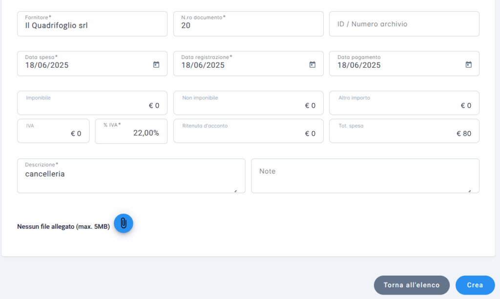 Inoltre, cliccando sul simbolo della graffetta in blu, sarà possibile aggiungere un allegato (es. ricevuta fiscale/scontrino) della dimensione di massimo 5MB.