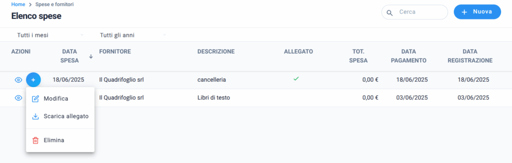 - Dal bottone azioni (blu col più) sarà possibile scaricare l’allegato (se presente), modificare la spesa inserita, oppure eliminarla (azione irreversibile).